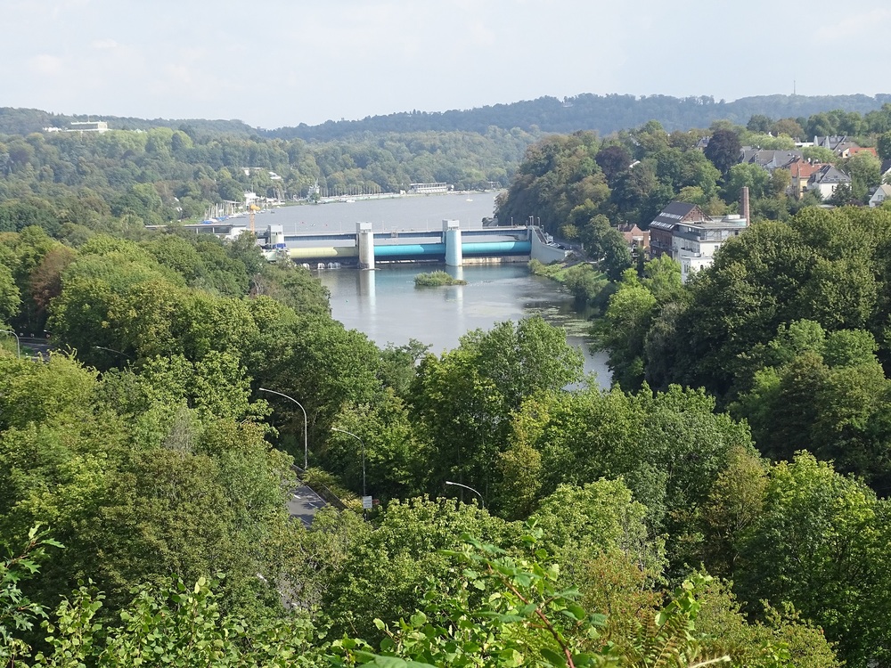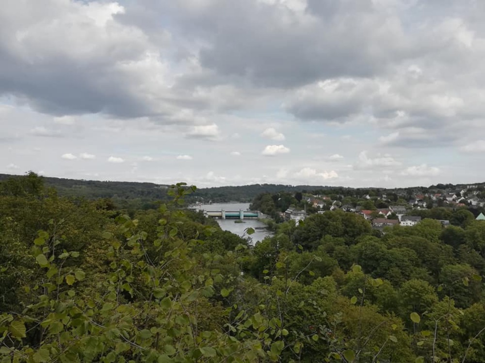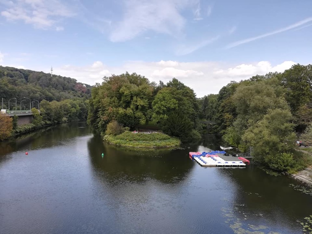 Beim Verlassen der Insel kommen uns einige Teams entgegen, das tut uns ganz gut – wir sind vielleicht doch nicht so weit hinten wie befürchtet. Zudem erspähen wir 200 Meter weiter einen Bäcker, kaufen ihm die letzten sechs Rosinenbrötchen ab und von nun an sollte es bergauf gehen. Mit uns und auch die Strecke. Die Rosinnebrötchenwende sozusagen. Nix wie hoch zum Aussichtspunkt Baldeneysee. Aussicht ignorieren wir – shame on us – es hat wirklich keiner von uns runtergeguckt und den See gesehn. Herrje. Paare benamsen ist unsere Aufgabe (Lolek und Bolek, Euphrat und Tigris,…) – und hier ist unser Alter sicher kein Nachteil, wir füllen die 96 Felder praktisch ohne Stift absetzen und googeln aus, Sugus erkennt sofort die sich ergebende Blindenschrift und wir decodieren: