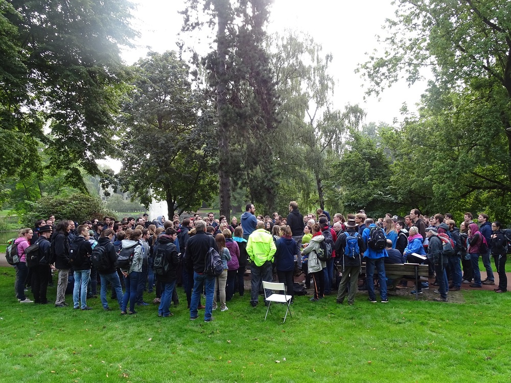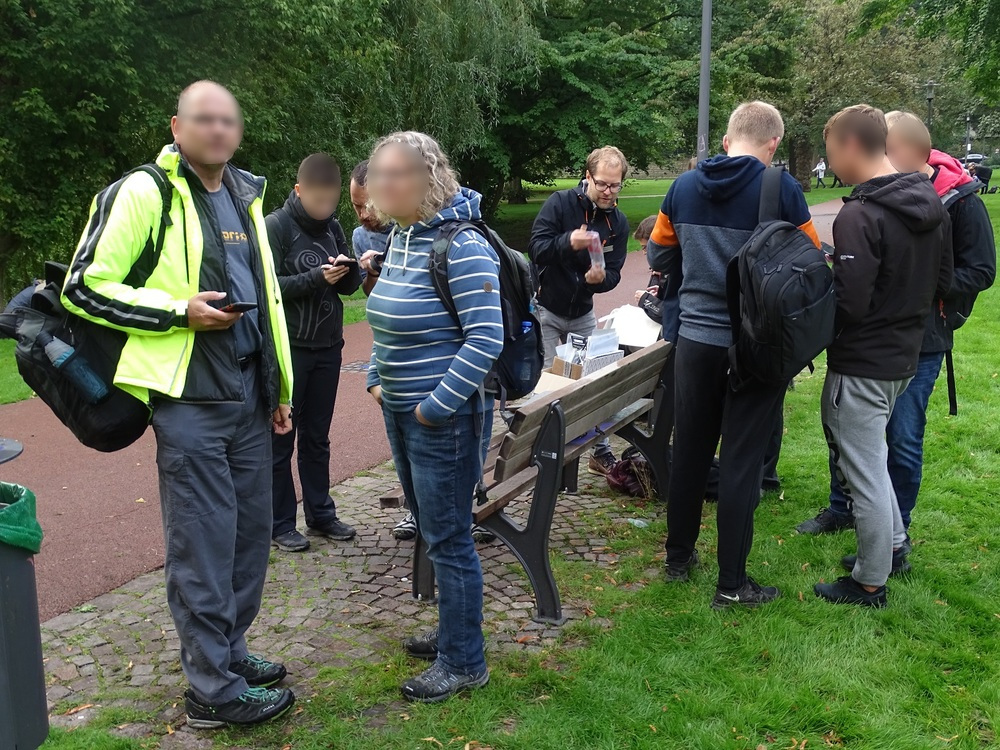 Und so rückten wir dann pünktlich um 8:30 Uhr im Stadtgarten an, zwei von uns mit viel zu wenig Kaffee im Blut und alle drei mit den unterschiedlichsten Vorstellungen über unsere Ziele für diesen Tag: Von „mindestens die Hälfte der Rätsel sollten wir schon hinkriegen“ bis „ich will schon vorne dabei sein“ war alles dabei und änderte sich im Laufe des Tages laufend.