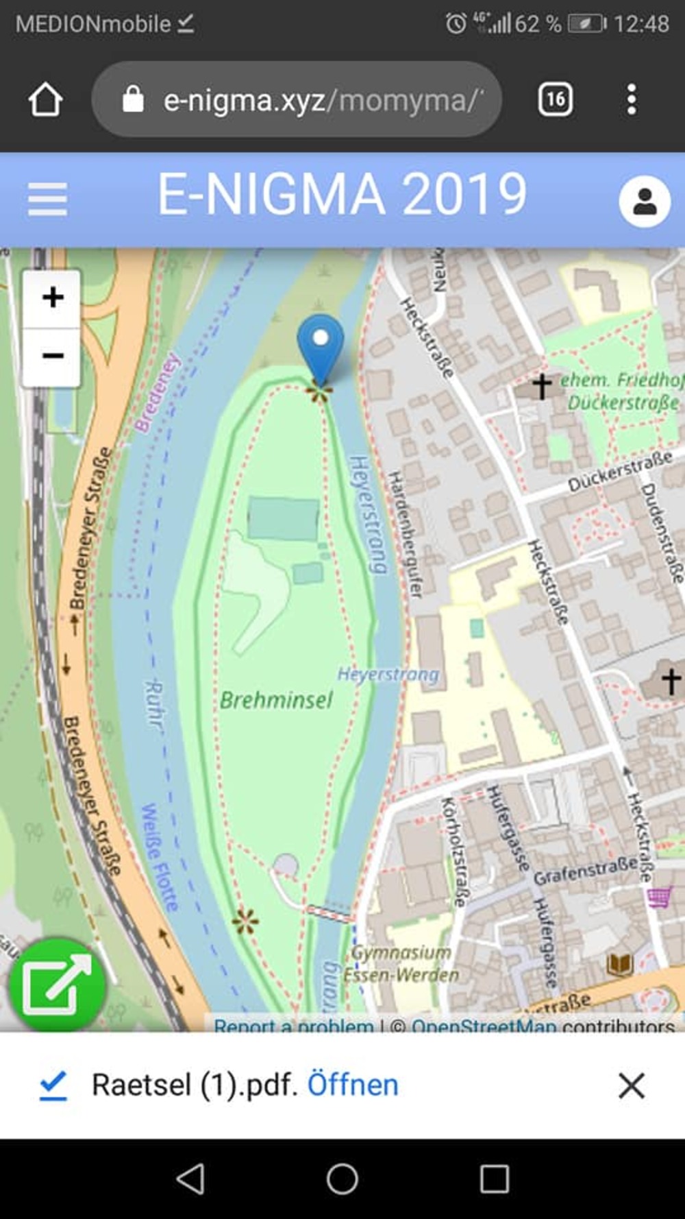 Und dann kommt unser Tief. Mittagsloch. Um die Zeit machen wir vermutlich sonst unser wohlverdientes Mittagsschläfchen. Also, Ankunft an Station 4, Stationscode eingeben, Zettel lesen – „nehmt schon mal die nächste U-Bahn nach Werden“. Die U-bahn ist hier nicht U, sondern Ü. Oder O – jedenfalls fährt sie oberirdisch, ich höre sie kommen und rufe „reeeeennt!“, aber meine Herren haben halt auch nimmer die Reaktionszeiten von damals, werden kein bisschen schneller und wir verpassen den Zug. Der nächste geht ne halbe Stunde später. In der Wartezeit füllt sich der Bahnsteig mit aufrückenden Teams, das bringt Unruhe und Unkonzentriertheit. Außerdem fehlt uns bei der Frage dieser Station eindeutig die Ortskenntnis, wir müssen praktisch jeden einzelnen Straßennamen googlemapsig verorten, das kostet uns richtig Zeit. Wir sind mit der Frage noch nicht einmal fertig als wir schließlich in Werden aussteigen. Und hier werden wir von richtig vielen Teams überholt. Irgendwann wissen auch wir, wo es weitergeht und schleppen unsere alten Knochen auf die Brehminsel. Unterzuckert und dehydriert. Unser Erschöpfungszustand wirkt so mitleiderregend, dass uns die Konkurrenz einen Weihnachtskeks spendiert. Dankeschön an dieser Stelle. Nützen tut der Spekulatius leider nichts, zwar entmorsen wir sofort den entscheidenden Code, verspekulieren uns aber bei der Bildersuche, genauer, wir vergaloppieren uns in Flaggenalphabete und schrammen schließlich um Haaresbreite an einem kostenpflichtigen Tipp vorbei, weil Supi uns zurückmorst.