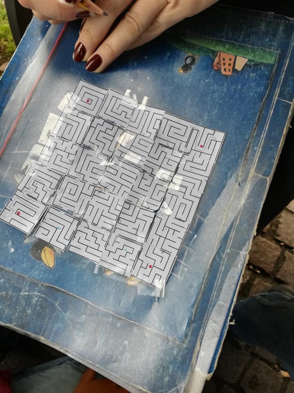 Die ersten Rätsel wurden verteilt, und wir freuten uns über die sehr nach Labyrinth aussehenden Puzzleteile – hatte uns doch das Labyrinth-Rätsel aus dem letzten Jahr, das wir zur Vorbereitung gelöst hatten, besonders gut gefallen. Also wurden die Teile ausgeschnitten, ich hielt es für eine gute Idee, etwas Rand zu lassen und musste einige Minuten später folgerichtig alle Ränder abschneiden… 25 Teile, alles klar, es muss ein 5x5-Quadrat werden. Die erste Idee, ein Labyrinth mit Eingang und Ausgang zu bauen („Der richtige Weg zeigt dann Buchstaben! So muss es sein!“) führte recht schnell ins Leere, und während andere Teams schon fröhlich pfeifend und mit ihrer Picknickdenke unterm Arm zum nächsten Rätsel aufbrauchen, hatten wir Eck- und Randteile identifiziert und klebten die zum Wegfliegen neigenden Zettelchen als Puzzle auf („Hmm, der Kleber ist schon 2018 abgelaufen. Wusstet ihr, dass Kleber ablaufen kann?“). Zwei- oder dreimal umsortieren und endlich passte alles und das Lösungswort war identifizierbar. Mindestens zwei Drittel der Teams waren schon unterwegs, als auch wir uns das zweite Rätsel abholten und einen genialen Rätselspaziergang durch das Viertel begannen.