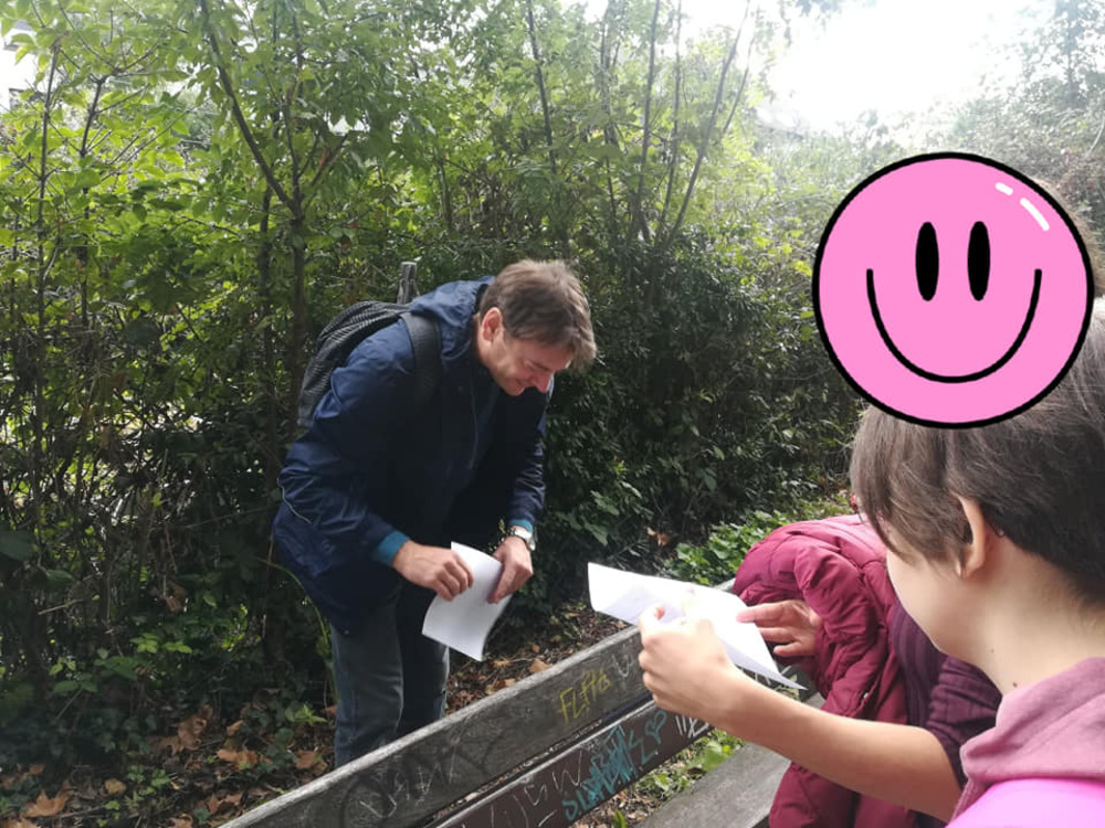 Am Gehege ist alles wild. Wildgehege eben. Und kein Bänkchen frei für uns. Auf mein Anraten laufen wir 100 Meter zurück, dort hatte ich ein freies Plätzchen entdeckt. Merke, es rätselt sich besser im Sitzen. Und merke weiter, es rätselt sich auch besser im Trocknen. Die Bank erweist sich als „best bench ever“ als es anfängt zu schütten, wir aber gemütlich und geschützt unter den Bäumen auf unserem Bänklein sitzen und die Motte Charlotte, die Qualle Chantalle und Hein, das Schwein in unseren Regenunterschupf flüchten. Auch hier überholen wir wieder zwei, drei Teams, die sich ob des Regens in die Büsche geflüchtet hatten oder dicht gedrängelt unter der Aussichtsplattform Schutz suchen. Wir verlassen die Rehgehegewege und wandern bergab auf unwegsamem Terrain zur Haltestelle Seeblick, wo uns eine Frage mit ganz vielen Autokennzeichen erwartet. In acht Minuten kommt der nächste Bus, kein anderes Team ist in der Nähe. Hier spielen wir erneut unseren besten Joker aus – unser Alter und unsere ErFAHRung. Hier im besten Wortsinn. Kurzes Brainstorming, was haben die Kennzeichen gemeinsam? Gleiches Bundesland? Nein. Alle am gleichen Fluss? Nein. Alle an der gleichen Autobahn, schlägt Marvin vor. Die Spur sieht vielversprechend aus, der Bus kommt, wir verfolgen die Spur und haben die Lösung noch bevor wir an der Margarethenhöhe ein paar Stationen weiter wieder aus dem Bus klettern. Überraschung! Hier sitzen mehrere Teams am Straßenrand und knabbern noch an der Autobahnfrage herum und wir führen unser Überholmanöver fort und fühlen uns großartig. Der Weg zum Marktplatz führt an Bierbänken, Grillwürstchen und dem entzückenden Charme der ehemaligen pittoresken Künstlerkolonie vorbei – wir müssen leider alles unbeachtet lassen. Dafür gibt’s die nächste Frage zwei Meter fünfzig neben einem Café. Kurzentschlossen kehren wir ein, man muss schnippeln, da ist ein Tisch und Milchkaffee grad recht. Außerdem liegen wir ganz gut, ganz vorne sicher nicht, weil die Bedienung schon andere hat schnipseln sehen. Wir kleben uns eine Wegbeschreibung zusammen und schrittezählen uns zur großen Marktplatzuhr und von da aus einem Team hinterher, das etwa 20 Meter, äh 28,7 Schritte vor uns um die Ecke biegt. Schnell haben wir sie eingeholt und laufen gemeinsam weiter. Eigentlich haben wir eine ausgefeilte Arbeitsteilung an dieser Stelle. Marvin gibt die Schrittzahl an, ich rechne in Meter um und Supi misst die Meter mit dem GPS. Zur Sicherheit zählt Sugus die Schritte mit. So die Theorie. In der Praxis quasselt Supi das andere Team voll und ist högscht unkonzentriert. Trotzdem (ha!) finden wir die nächste Station.