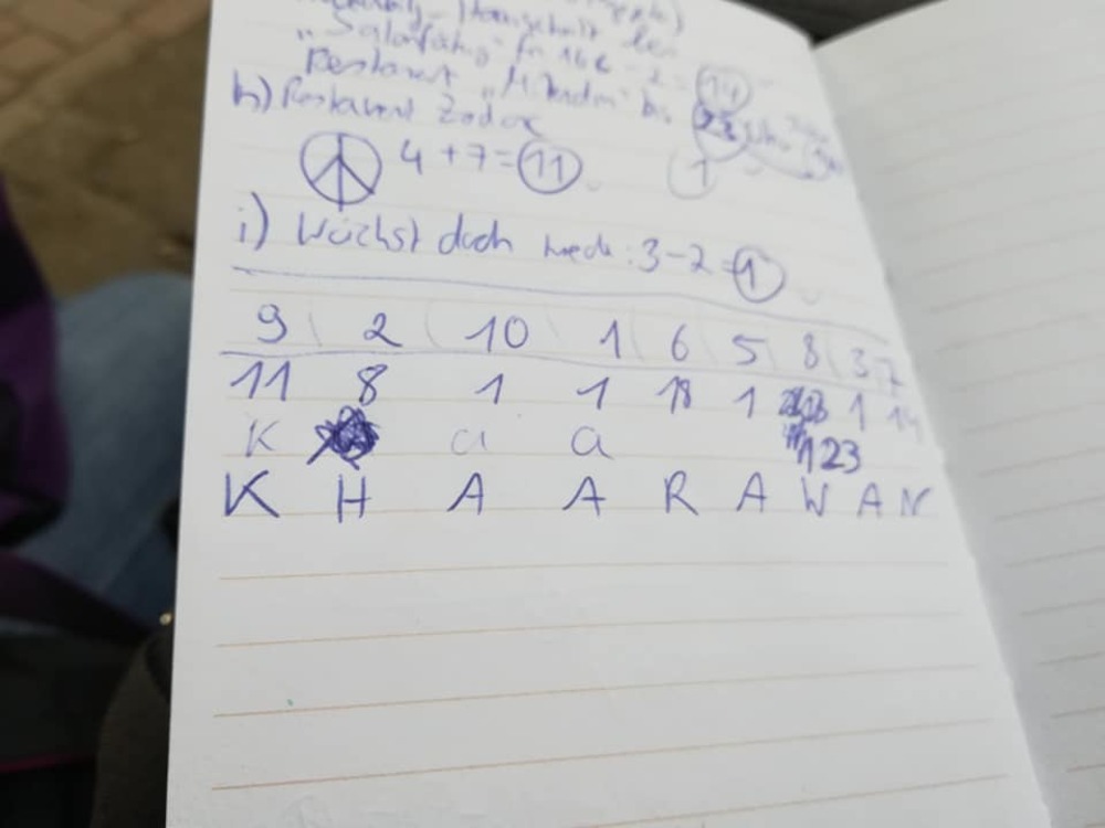 Auf zur Margarethenhöhe – genau vor dem Studentenwohnheim, in dem zwei von uns mal gewohnt hatten („wenn du das noch einmal jemanden erzählst, spielen wir ohne dich weiter!“), saßen wir und brüteten über den Autokennzeichen. Zusammenhänge zu finden war gar nicht so schwer, Konzentration auf bestimmte Bundesländer, sich wiederholende Städte, feste Reihenfolgen, aufeinanderfolgende Buchstaben, aber keine heiße Spur. Zwei Telefonate mit der Hotline brachten uns zwar weiter, aber nun ließ uns auch noch unser Tablet im Stich – google maps moche nicht mehr mitspielen und der Tipp, die Karte einzusetzen, ließ sich nicht mehr umsetzen. Während andere Gruppen mit zufriedenem Gesichtsausdruck an uns vorbeiliefen, stellten wir fest, dass das nicht unser Rätsel war und da wir schon so lange daran rumknobelten, fällten wir schweren Herzens die Entscheidung, es zu überspringen.