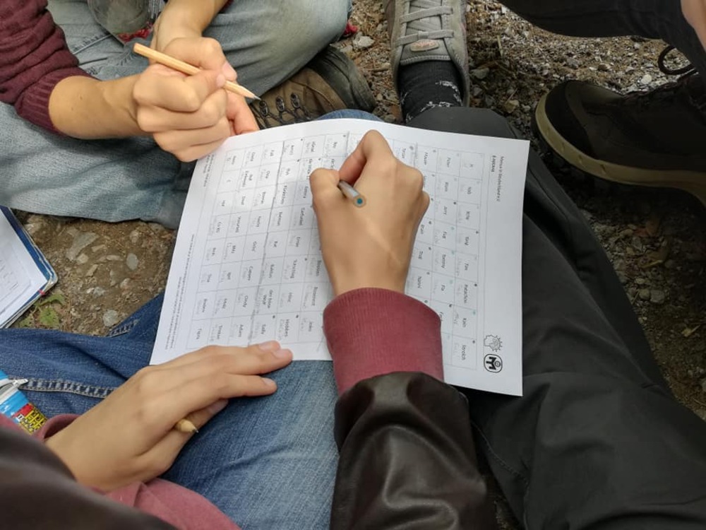 An dem schönen Aussichtspunkt lieferten wir eine unserer besten Leistungen ab – fanden die Partner, nummerierten, zückten das Infoheft, und da die Anzahl der Kästchen nicht zu ASCII passten, und es für Braille genau hinkam, entstanden blitzartig die ersten Buchstaben.