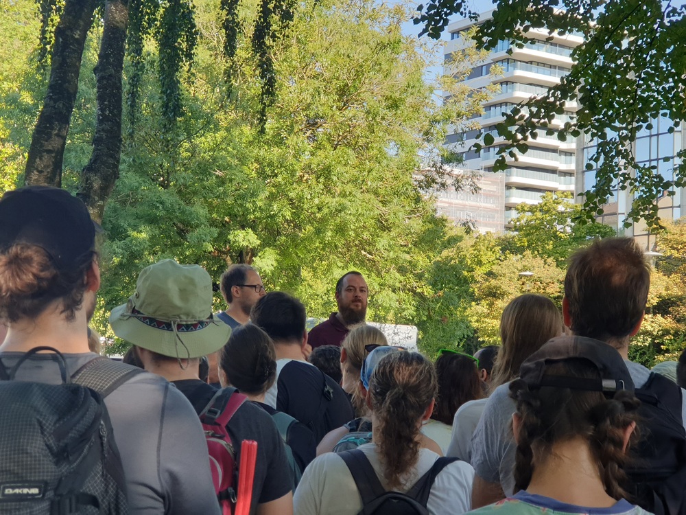 Glücklicherweise hat der Bus zu unserem Ziel ausreichend Kapazität; im Bus selbst entstehen die ersten Ideen für die Zusatzrätsel. Sämtliche acht bis zehn Teams in diesem Bus fahren eine Station zu weit.