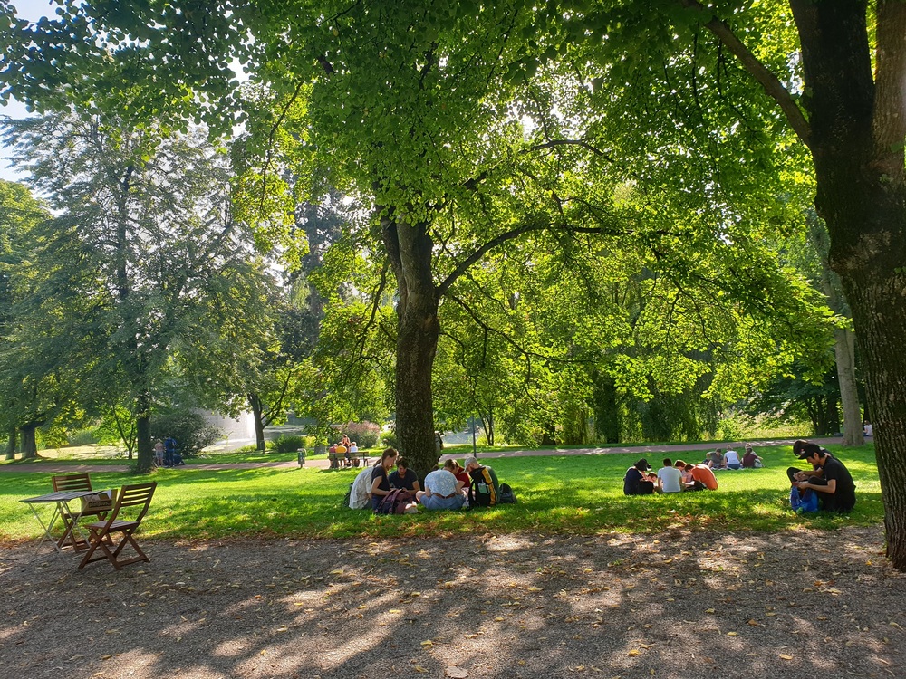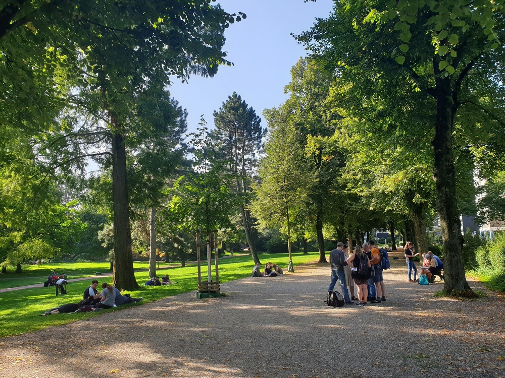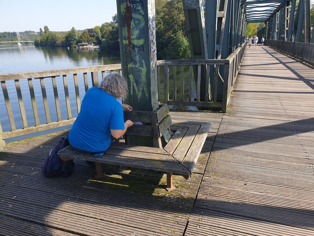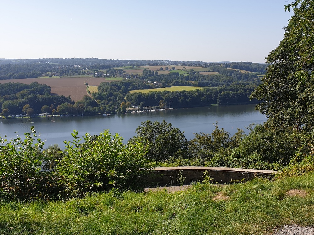 Leider konnten wir vom großartigen Ausblick auf der Korte-Klippe nicht lange profitieren; ein Sprint zum Bus Richtung Baldeneysee ermöglichte uns einerseits, die “Strickflaschen” wieder einzuholen (“wenn wir mit denen gleichziehen, können wir ja so schlecht nicht im Rennen”), und andererseits, die 30 Grad Mittagssonne “mal so richtig zu genießen”.